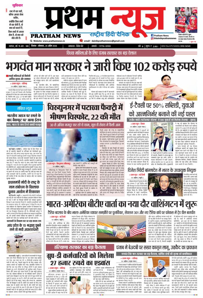 Homeई पेपर ई पेपर E paper 20-04-2026 By Shiv Kumar April 20, 2026 0 6 FacebookTwitterPinterestWhatsApp Post Views: 102 Like this:Like Loading... Related Share FacebookTwitterPinterestWhatsApp Previous articleअमरनाथ यात्रा 2026: श्रद्धालुओं में भारी उत्साह, 3 दिनों में 2 लाख से अधिक पंजीकरण; जानें नियम और पंजाब के मुख्य रजिस्ट्रेशन केंद्रNext articleE paper 21-4-2026 Shiv Kumarhttps://prathamnews.in/ Related Articles ई पेपर E paper 21-4-2026 जालंधर अमरनाथ यात्रा 2026: श्रद्धालुओं में भारी उत्साह, 3 दिनों में 2 लाख से अधिक पंजीकरण; जानें नियम और पंजाब के मुख्य रजिस्ट्रेशन केंद्र जालंधर पंजाब देश का पहला राज्य बन गया है जहां स्वास्थ्य बीमा योजना लागू की गई है – मोहिंदर भगत LEAVE A REPLY Cancel reply Comment: Please enter your comment! Name:* Please enter your name here Email:* You have entered an incorrect email address! Please enter your email address here Website: Save my name, email, and website in this browser for the next time I comment. Latest Articles ई पेपर E paper 21-4-2026 जालंधर अमरनाथ यात्रा 2026: श्रद्धालुओं में भारी उत्साह, 3 दिनों में 2 लाख से अधिक पंजीकरण; जानें नियम और पंजाब के मुख्य रजिस्ट्रेशन केंद्र जालंधर पंजाब देश का पहला राज्य बन गया है जहां स्वास्थ्य बीमा योजना लागू की गई है – मोहिंदर भगत गुरदासपुर ‘बेटी बचाओ-बेटी पढ़ाओ’ स्कीम तहत गांव डेहरीवाल किरण में जागरूकता कैंप लगाया पंजाब पंजाब के ऐतिहासिक त्योहार बसंत का रंग हर साल चाइना की डोर से फीका पड़ जाता है: डॉ. आशीष सरीन Load more